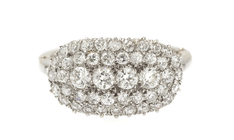 containing four transitional brilliant cut diamonds weighing approximately 0.60 carat total and 42 old European and transitional brilliant cut diamonds weighing approximately 1.26 carats total, later expandable shank.Stamp: 14K FINGER FIT.