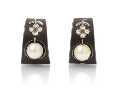 A Pair of Art Moderne Blackened Steel, White Gold, Cultured Pearl and Diamond Earclips, Marsh & Co.,