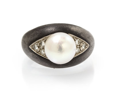 An Art Moderne Blackened Steel, White Gold, Cultured Pearl and Diamond Ring, Marsh & Co.,