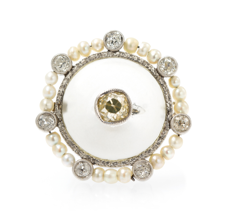 containing one antique cushion cut diamond weighing approximately 0.70 carat bezel set within a frosted rock crystal surround bordered by seven equidistant bezel set old mine cut diamonds weighing approximately 0.63 carat total joined by wire set seed pearls.