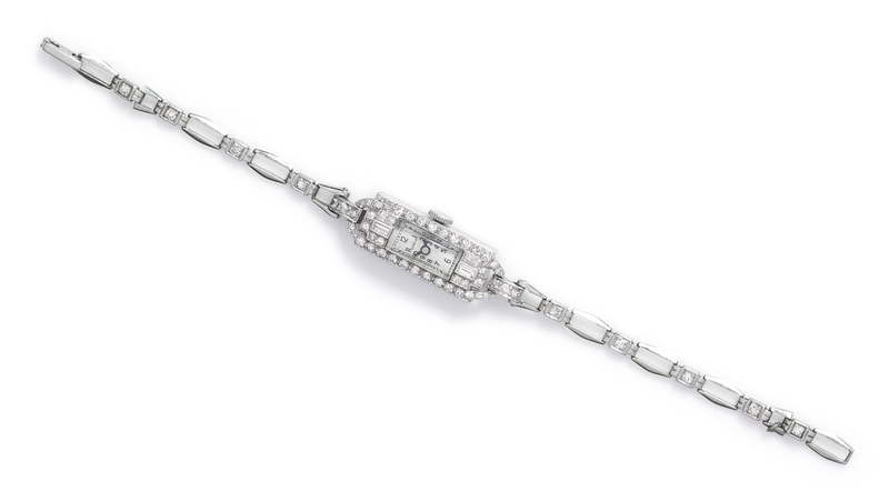 the bezel, lugs and bracelet containing two baguette cut and numerous round single cut diamonds weighing approximately 0.90 carat total, 23.00 x 10.00 mm case dimensions, matte silvered dial signed SHREVE, Arabic numerals, blued steel index hands, hinged case back, manual wind 17 jewel movement signed M. Choffat & Co., white gold open link bracelet punctuated at the joints with box set diamonds.