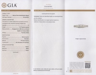in an open geometric design accented with millegrain edgework and a pierced double gallery, containing five pearls measuring approximately 4.88-6.40 mm in diameter, together with 31 old mine, old European and old single cut diamonds weighing approximately 2.60 carats total, and numerous rose cut diamonds.Accompanied by a Gemological Institute of America pearl identification certificate number 5161657251, dated October 3, 2014, stating Pearls: Natural, Environment: Saltwater, Species: Pinctada, Treatment: No indications of treatment, Shape: Button, Bodycolor: White, Overtone: Orient.