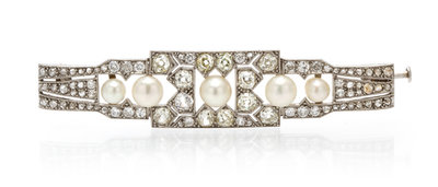 An Art Deco Platinum, Diamond and Natural Pearl Bar Brooch,