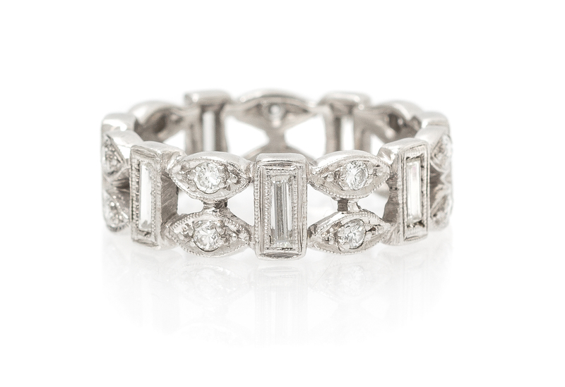 in an openwork two row design, containing seven baguette cut diamonds weighing approximately 0.56 carat total and 14 round brilliant cut diamonds weighing approximately 0.32 carat total.