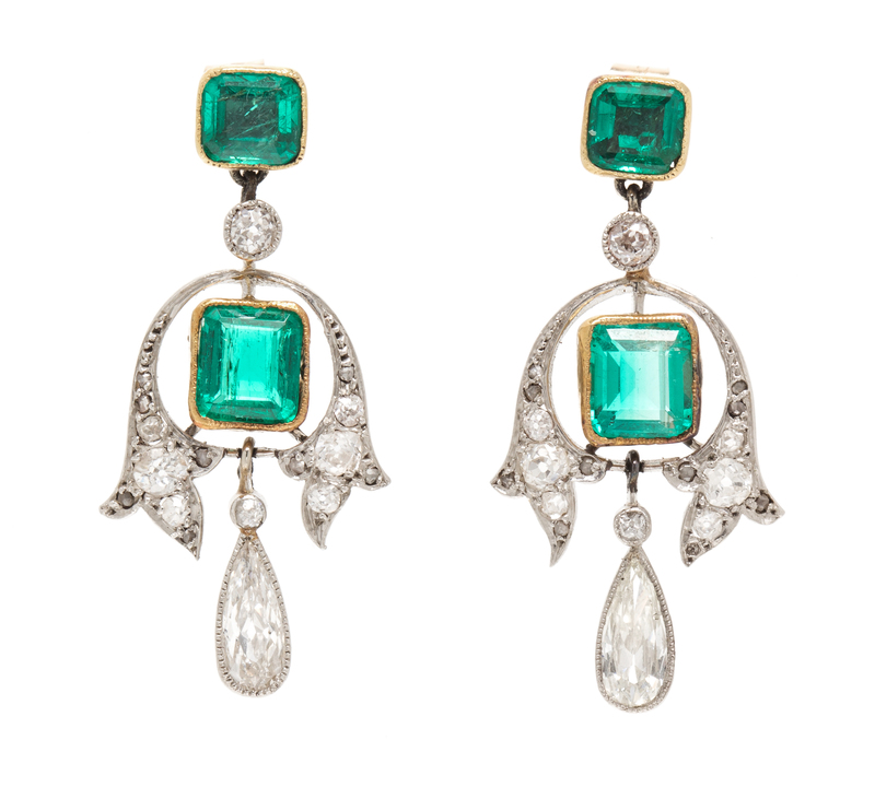 containing four octagonal step cut emeralds weighing approximately 2.28 carats total within gold bezel settings suspending and surrounded by fleur-de-lys motif platinum work containing numerous old mine cut and single cut diamonds weighing approximately 0.30 carat total, the bases supporting two millegrain edged bezel set elongated pear shape diamonds weighing approximately 0.66 carat total.Accompanied by a fitted case signed S.J. Phillips Jeweller 113 New Bond St. London.