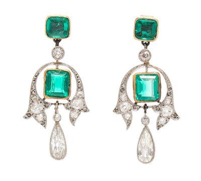 A Pair of Edwardian Yellow Gold, Platinum, Emerald and Diamond Earrings,