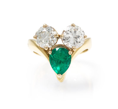 containing one old European and one transitional brilliant cut diamond weighing approximately 3.00 carats total and one pear shape mixed cut emerald weighing approximately 1.50 carats.