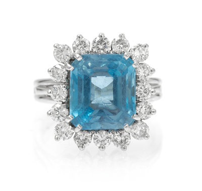 containing one octagonal step cut aquamarine measuring approximately 10.91 x 9.42 x 7.54 mm and 16 round brilliant cut diamonds weighing approximately 1.12 carats total.Stamp: PLAT 907.
