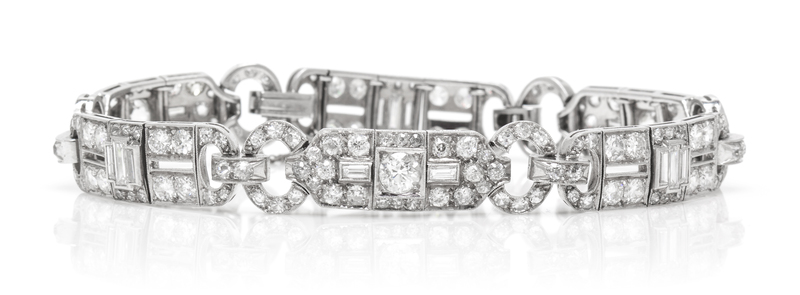 consisting of curvilinear, rectangular and open oval links in a repeated pattern, containing three old European cut diamonds weighing approximately 1.15 carats, 180 old European, old mine cut and round single cut diamonds weighing approximately 4.70 carats total, and 15 baguette cut diamonds weighing 1.07 carats total.