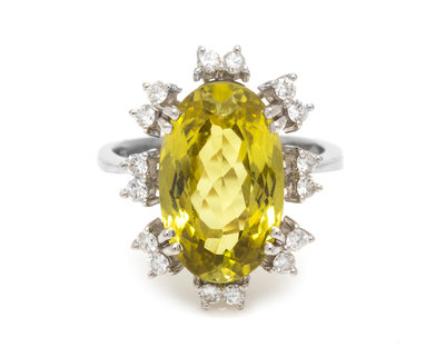 containing one oval mixed cut yellow chrysoberyl measuring approximately 16.28 x 10.10 x 5.91 mm and 16 round brilliant cut diamonds weighing approximately 0.40 carat total.Stamp: 750 (maker's mark).