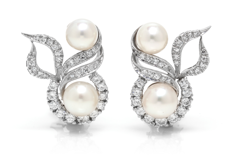 in a spray design containing four cultured pearls measuring 7.78-8.66 mm in diameter and 66 round brilliant and single cut diamonds weighing approximately 1.40 carats total.