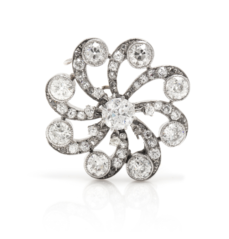 containing one old European cut diamond weighing approximately 0.90 carat, eight old European cut diamonds weighing approximately 2.40 carats total, and numerous old European and rose cut diamonds weighing approximately 1.12 carats total.Stamp: (obscured).