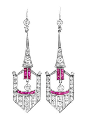 modern in an Art Deco drop design, containing numerous round brilliant cut diamonds weighing approximately 1.46 carats total and 30 calibre French cut rubies.