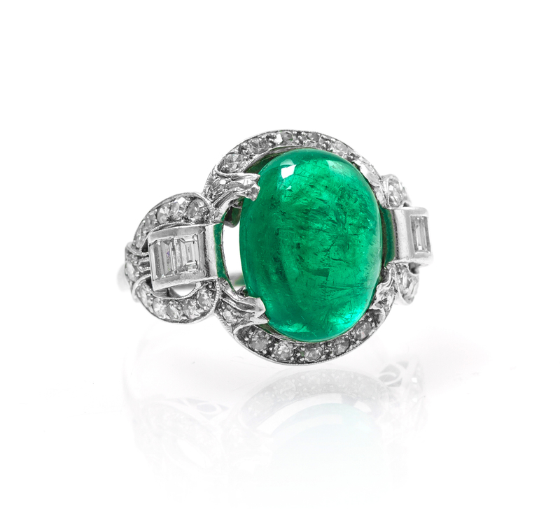 in an openwork design, containing an oval cabochon cut emerald weighing approximately 4.90 carats surrounded by 36 round single cut diamonds weighing approximately 0.36 carat total and six baguette cut diamonds weighing approximately 0.36 carat total, filigree gallery.Stamp: 10% IRID.