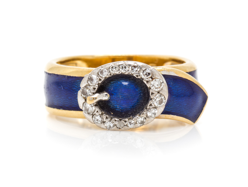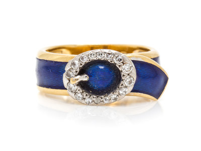 in a yellow gold belt motif accented with translucent blue enamel surmounted with a white gold buckle motif containing numerous round single cut diamonds weighing approximately 0.18 carat total.Stamp: 18 (British gold assay marks).