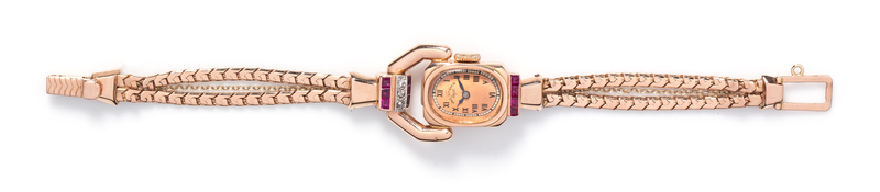 A Retro 14 Karat Rose Gold, Ruby and Diamond Wristwatch, Paul Ditisheim,