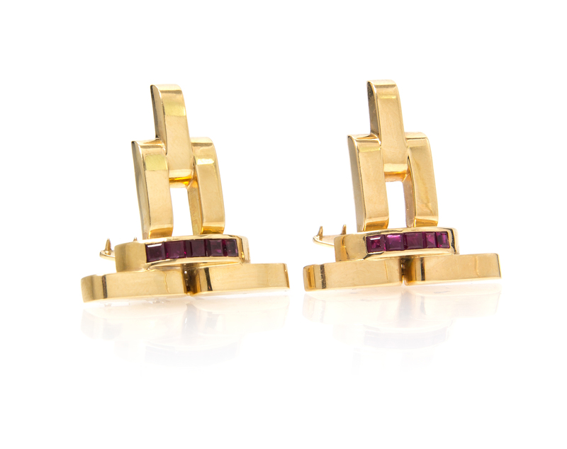 A Pair of Retro 14 Karat Yellow Gold and Ruby Dress Clips, Wordley, Allsopp & Bliss,