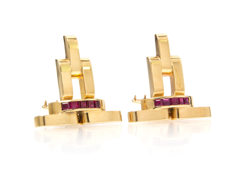 in an openwork geometric design consisting of polished curved sections, containing 10 square step cut rubies, the clips measuring approximately 33.00 x 33.00 mm each.Stamp: 14K WAB (maker's mark for Wordley, Allsopp & Bliss).