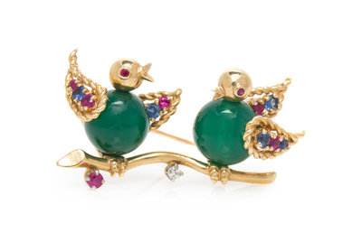 depicting birds on a branch, containing two round dyed green chalcedony beads, one round brilliant cut diamond, eight round mixed cut rubies and five round mixed cut sapphires.Stamp: 14K.