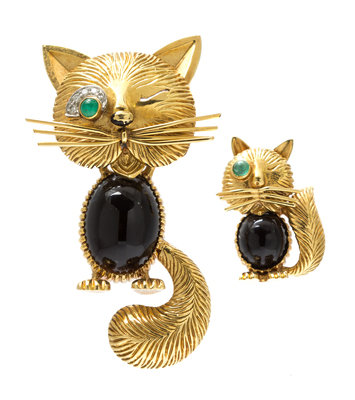 depicting a winking cat and kitten, consisting of a larger clip containing one oval cabochon cut onyx measuring approximately 14.85 x 11.50 x 5.86 mm, one round cabochon cut emerald and five round brilliant and single cut diamonds weighing approximately 0.05 carat total, together with a smaller clip containing one oval cabochon cut onyx measuring approximately 7.93 x 7.32 x 4.86 mm and one round cabochon cut emerald.Larger pin stamp: Van Cleef & Arpels N.Y.Larger pin hand inscribed: 1V129-59.Smaller pin hand inscribed: 1V119-46.