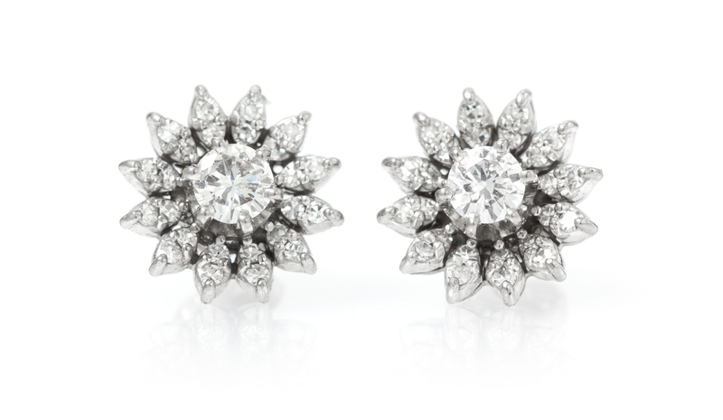the cluster settings containing two round brilliant cut diamonds weighing approximately 0.64 carat total, surrounded by 48 round single cut diamonds weighing approximately 0.23 carat total.