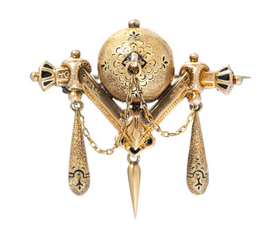 consisting of a central orb above the V shape base suspending three hinged drop pendants, accented throughout with black enamel detail, stippled texture and embossed fleur-de-lys designs, measuring approximately 42.00 x 39.00 mm.