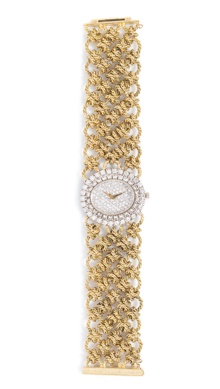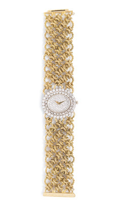 the bezel and pave set dial containing numerous round brilliant cut diamonds weighing approximately 2.60 carats total, 32.00 x 28.00 mm case dimensions, gold dauphine hands, oval white gold case, snap on case back, manual wind mechanical movement, integrated yellow gold twisted wirework link meshwork bracelet, slide bar clasp.Case back stamp: (Swiss assay mark).Clasp stamp: FRANCE 18K (maker's mark).
