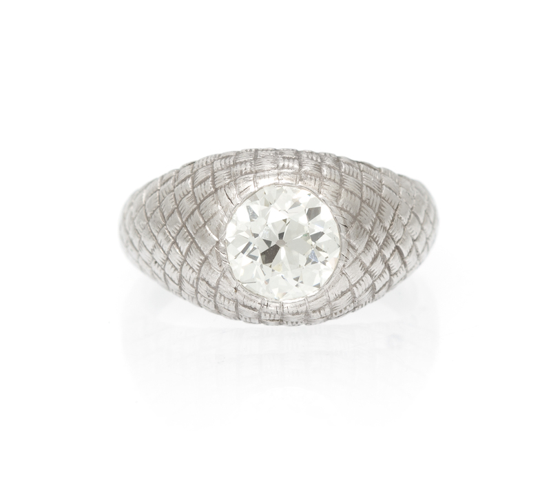 in an intricately textured basketweave motif, containing one bezel set old European cut diamond weighing approximately 1.42 carats.Stamp: 10%IRID PLAT.