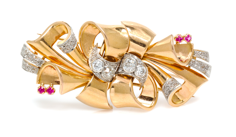 consisting of two stylized ribbon motif gold clips in a mirrored layout accented with platinum overlays containing four old European cut diamonds weighing approximately 0.90 carat total together with numerous round single and rose cut diamonds, the terminals containing four round mixed cut rubies.