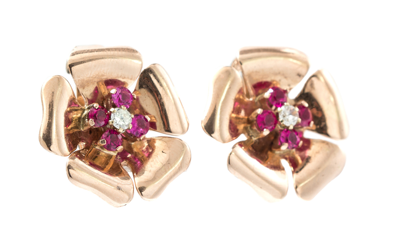 A Pair of Rose Gold, Synthetic Ruby and Diamond Earclips,