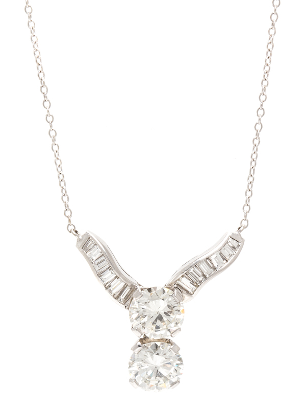 consisting of a central pendant containing one round brilliant cut diamond weighing approximately 1.83 carats, one round brilliant cut diamond weighing approximately 1.84 carats and 12 baguette cut diamonds weighing 0.70 carats, suspended from a 14 karat white gold cable chain.