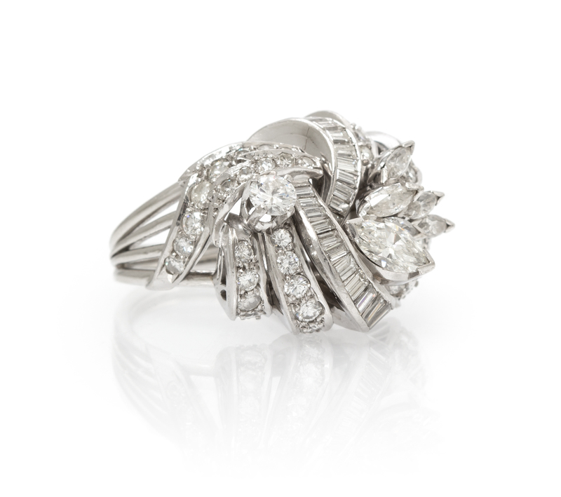 in asymmetric knot motif design, containing six marquise cut diamonds weighing approximately 0.95 carat total, 51 round brilliant cut diamonds weighing approximately 1.53 carats total and 22 baguette cut diamonds weighing approximately 0.88 carat total, open wirework shank.