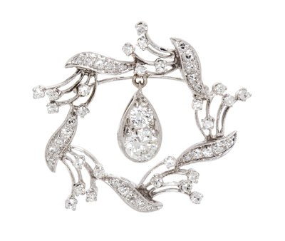 in a wirework design with central hinged pendant, containing one round brilliant cut diamond weighing approximately 0.71 carat, one round brilliant cut diamond weighing approximately 0.25 carat and 50 round single cut diamonds weighing approximately 1.00 carat total.