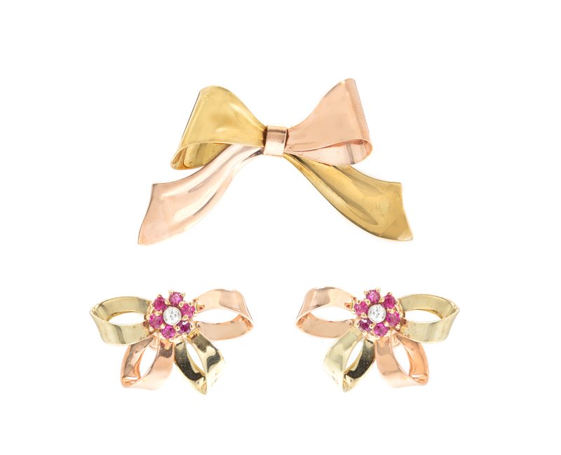 consisting of one bow brooch and one pair of bow earrings composed of yellow and rose gold and containing two round brilliant cut diamonds weighing approximately 0.16 carat total and 12 round mixed cut rubies weighing approximately 1.09 carats total.Stamp: 14K.
