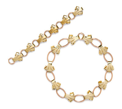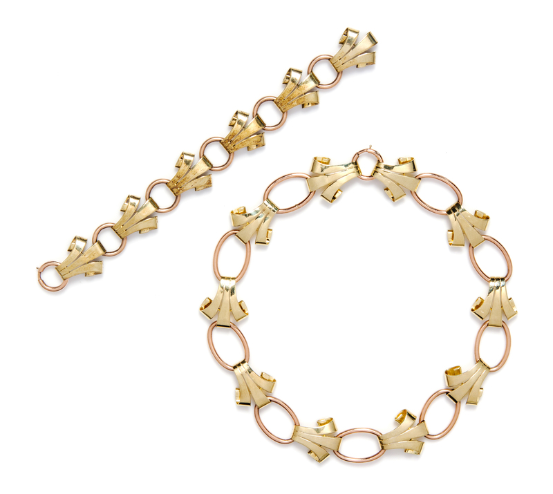 consisting of a necklace and matching bracelet, each consisting of trifurcated and scrolled yellow gold links joined with oval and circular rose gold links.Stamp: 14K.