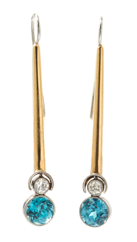 A Pair of Platinum, Gold, Blue Zircon, and Diamond Pendant Earrings,