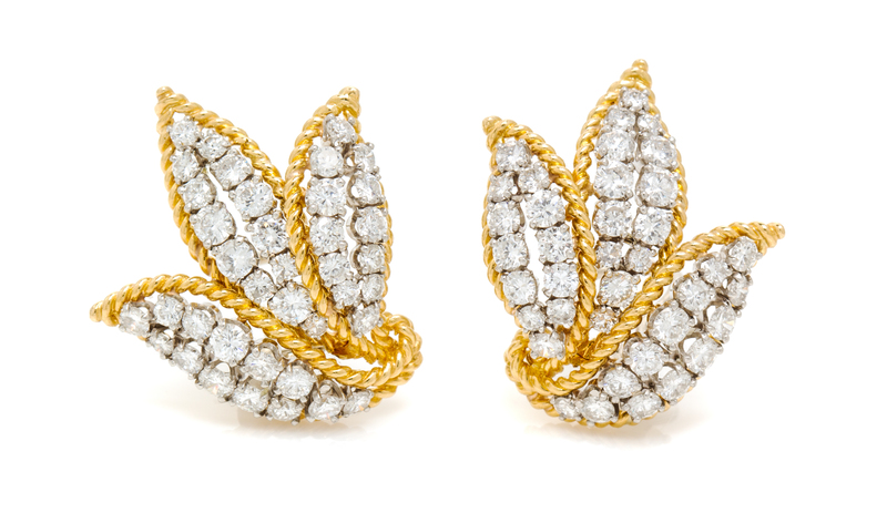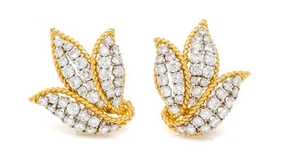 A Pair of Vintage Platinum, Yellow Gold and Diamond Leaf Motif Earclips, Circa 1950,