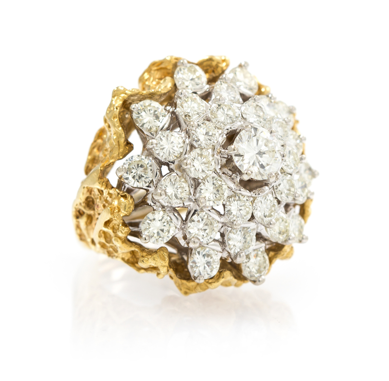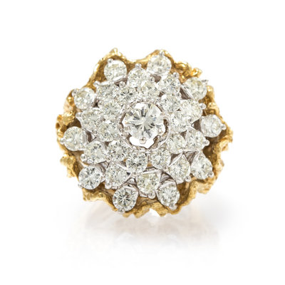 the white gold cluster setting ring containing one round brilliant cut diamond weighing approximately 0.67 carat and 30 round brilliant cut diamonds weighing approximately 3.60 carats total, the yellow gold jacket ring in a nugget texture.