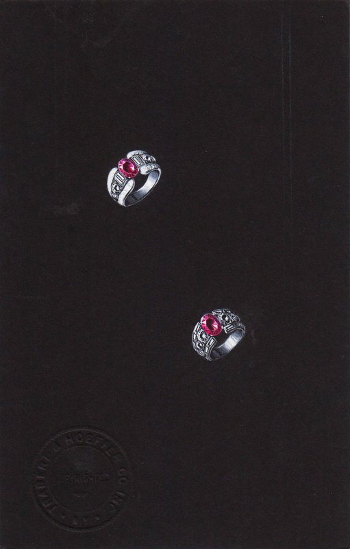 consisting of 33 original renderings, including 26 designs for Trabert & Hoeffer-Mauboussin of various subject matter, the majority embossed with "Reflections" copyright mark, many with stone sizes and counts on the reverse, many with black matting, together with six "Styles of the Next Half Century" original designs all signed A. Geyer.