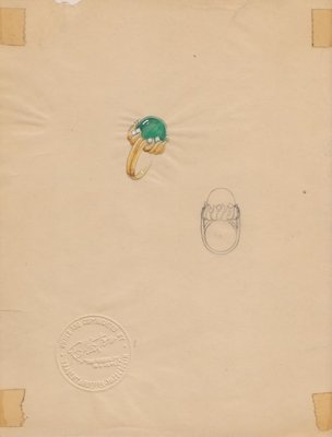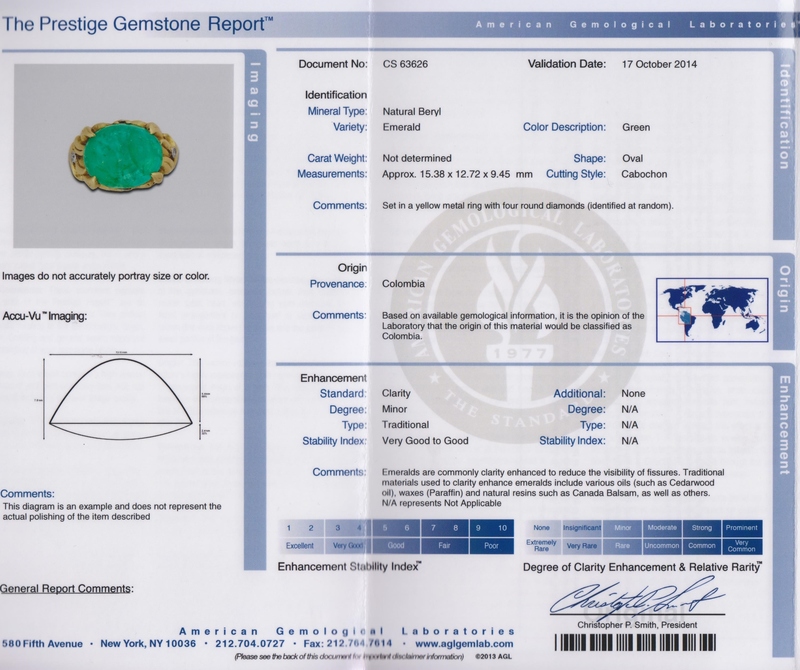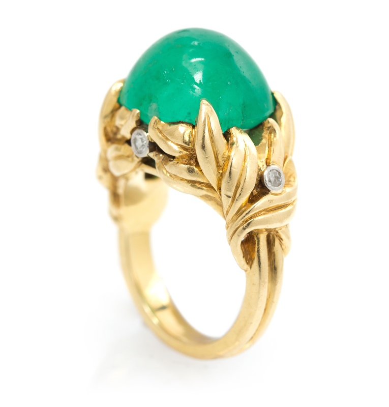 in a foliate motif, the sculpted gold setting containing one oval cabochon cut emerald measuring approximately 15.38 x 12.72 x 9.45 mm and four round single cut diamonds weighing approximately 0.08 carat total.Stamp: T&HM.Accompanied by an American Gemological Laboratories emerald identification and origin certificate number CS 63626, dated October 17, 2014, stating Mineral Type: Natural Beryl, Variety: Emerald, Origin: Colombia, Clarity Enhancement: Minor, Type: Traditional.Accompanied by the original rendering, executed by Anne Howe Geyer and embossed with the "Reflection" mark for Trabert&Hoeffer-Mauboussin.