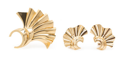 consisting of a fluted fan form clip brooch, together with a pair of matching earclips.Brooch stamp: TRABERT&HOEFFER MAUBOUSSIN 4162 Reflection.Earclip stamp: T&HM 6981.