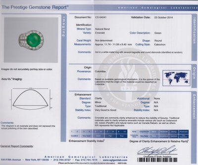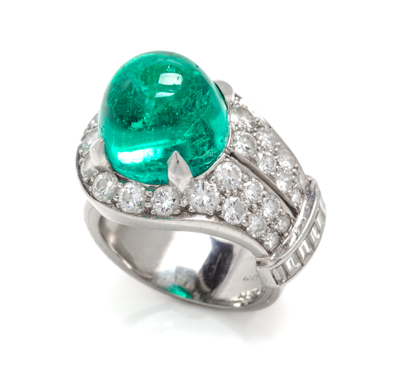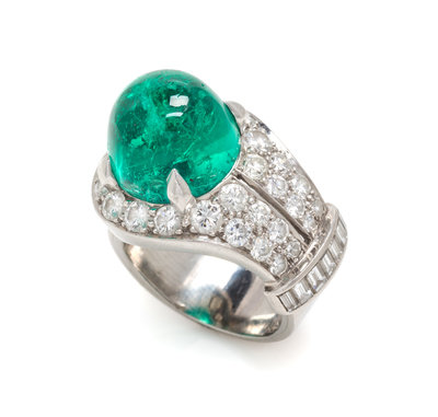 the asymmetric design containing one round high-dome cabochon cut emerald measuring approximately 11.74 x 11.59 x 9.40 mm, 26 round brilliant and single cut diamonds weighing approximately 1.50 carats total, and seven baguette cut diamonds weighing approximately 0.32 carat total.Hand inscribed: TH&M PLATINUM MADE IN ENGLAND.Accompanied by an American Gemological Laboratories emerald identification and origin certificate number CS 64041, dated October 23, 2014, stating Mineral Type: Natural Beryl, Variety: Emerald, Origin: Colombia, Clarity Enhancement: Minor, Type: Traditional.