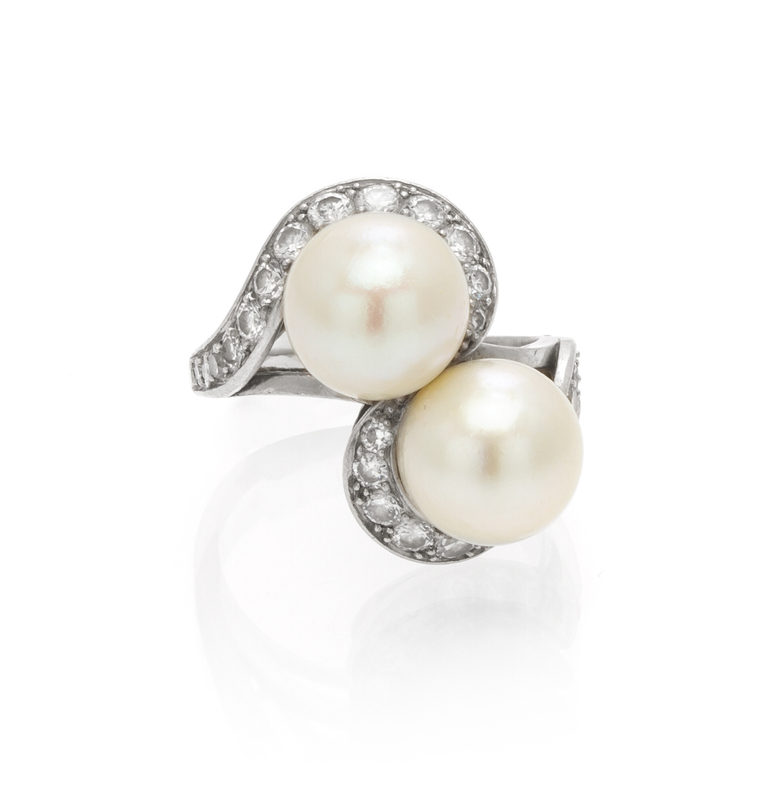 containing two pearls measuring 9.12-9.20 mm in diameter and 26 round brilliant cut diamonds weighing approximately 0.58 carat total.Stamp: (French platinum assay mark) (obscured maker's mark).