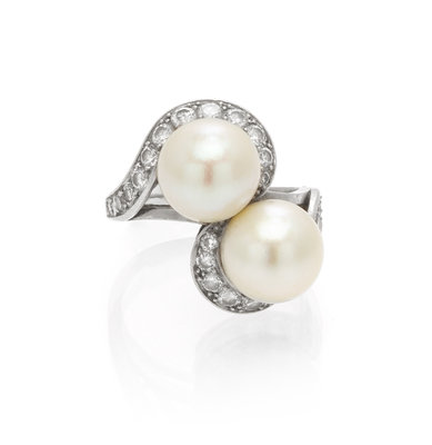 A Platinum, Cultured Pearl and Diamond Toi et Moi Ring, French,