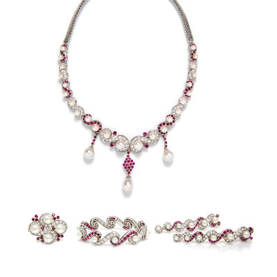 in a repeated S-curve motif, consisting of a necklace, the front comprised of sections alternately set with numerous round mixed cut rubies and 92 round brilliant cut diamonds weighing approximately 2.85 carats total and accented with 24 graduated pearls measuring approximately 4.03-8.13 mm in diameter, the center suspending three pendants containing numerous round mixed cut rubies and three drop pearls measuring approximately 9.30-9.75 mm in diameter, the back chain of open weave mesh design, together with a link bracelet alternately set with 55 round mixed cut rubies and 55 round brilliant cut diamonds weighing approximately 2.25 carats total and accented with ten pearls measuring approximately 5.44-5.68 mm in diameter, a pair of barrettes alternately set with 52 round mixed cut rubies and 60 round brilliant cut diamonds weighing approximately 2.08 carats total accented with 12 pearls measuring approximately 3.95-6.60 mm in diameter, and a brooch containing 16 round mixed cut rubies and 34 round brilliant cut diamonds weighing approximately 0.90 carat total accented with four pearls measuring approximately 8.75-8.85 mm in diameter.Stamp: (French platinum and gold assay marks) (obscured maker's mark).NOTE: The parure contains scattered synthetic rubies accounting for less than 5% of the total.