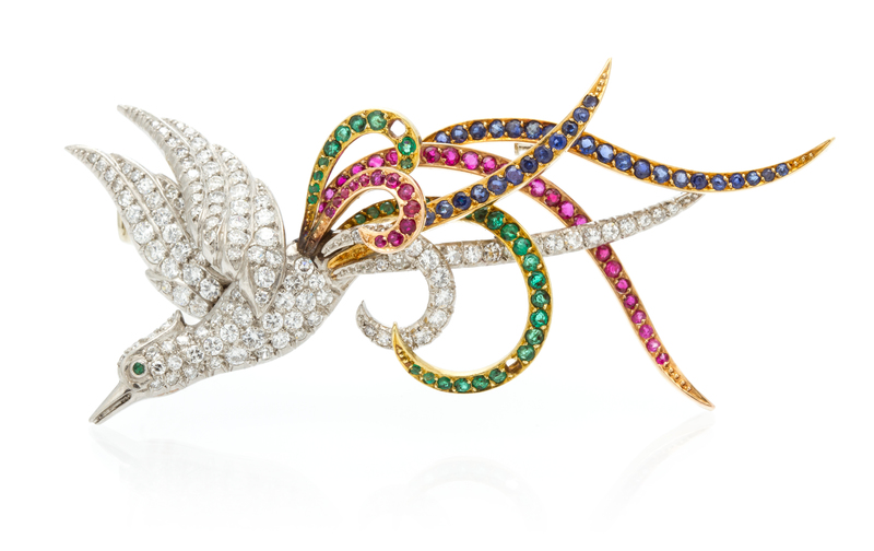 depicting the exotic bird in flight, the platinum body, wings and two tail feathers containing numerous round brilliant and single cut diamonds weighing approximately 1.96 carats total, the remaining yellow gold tail feathers set with 35 round mixed cut emeralds, 39 round mixed cut and 32 round mixed cut sapphires.
