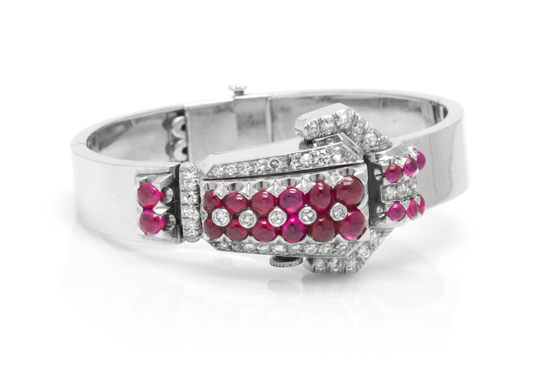 in an asymmetrical bangle design with hinged base, containing 20 round cabochon cut rubies and 44 old European and round single cut diamonds weighing approximately 1.01 carats total, brushed silvered dial, baton numerals, blued steel index hands, snap on case back, manual wind 17 jewel movement signed LACKRITZ, hidden box clasp with safety.Stamp: LACKRITZ.
