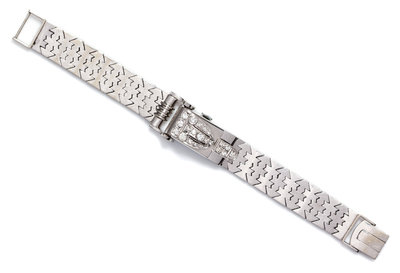 the hinged dial cover and lugs containing numerous round brilliant and single cut diamonds weighing approximately 0.85 carat total, white dial, applied silvered pyramid and dot numerals, blued steel feuille hands, rectangular case, 17 jewel manual wind movement signed LOCKWOOD WATCH CO., white gold geodesic link bracelet with box clasp.