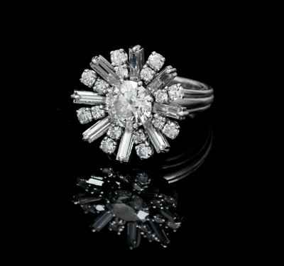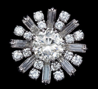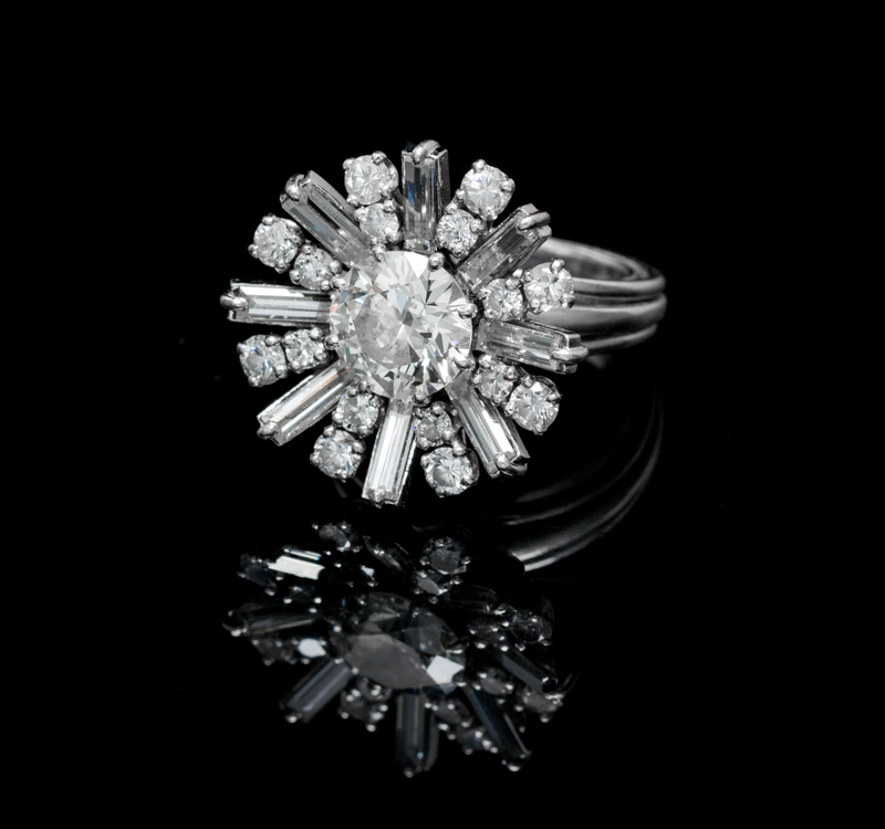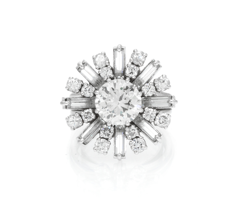 in a concave circular cluster, containing one round brilliant cut diamond measuring approximately 8.11 x 8.15 mm surrounded by eight baguette cut diamonds weighing approximately 1.36 carats total and 16 round brilliant cut diamonds weighing approximately 0.96 carat total, intricate open wirework gallery and triple band shank.Stamp: (French platinum and gold assay marks).