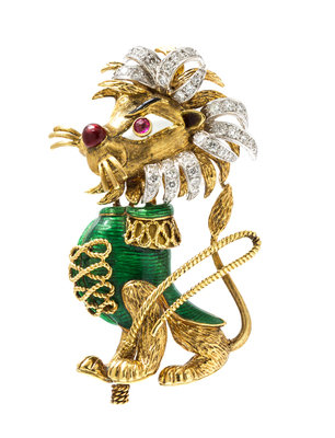 whimsically depicting a regal lion in intricately textured white and yellow gold, the head and mane containing numerous round brilliant cut diamonds weighing approximately 1.21 carats total and one rose cut ruby eye within a white enamel section, the torso accented in translucent green enamel over textured gold and further detailed with applied twisted rope texture wirework.Stamp: M 18K ITALY.